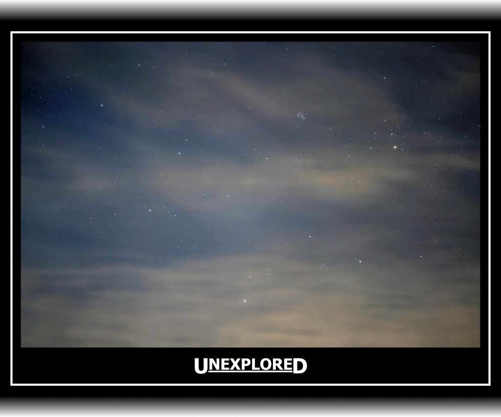 The topic of this week’s photo project is unexplored. There are so many unexplored areas of space. I put my phone done and took an astrophotography shot. Too bad the clouds decided to come in when I was taking this photo.