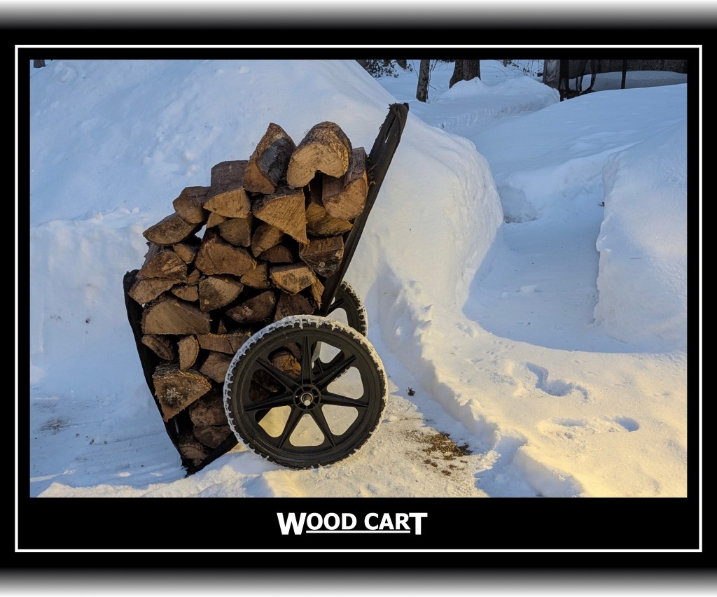 I had to get some wood this morning and had an inspiration to take this photo. It shows our wood cart and some paths that I snow blew in our yard. One path goes to our shed and the other path goes to our basement. The one to the basement is to give me access to our generator if I need to use it.