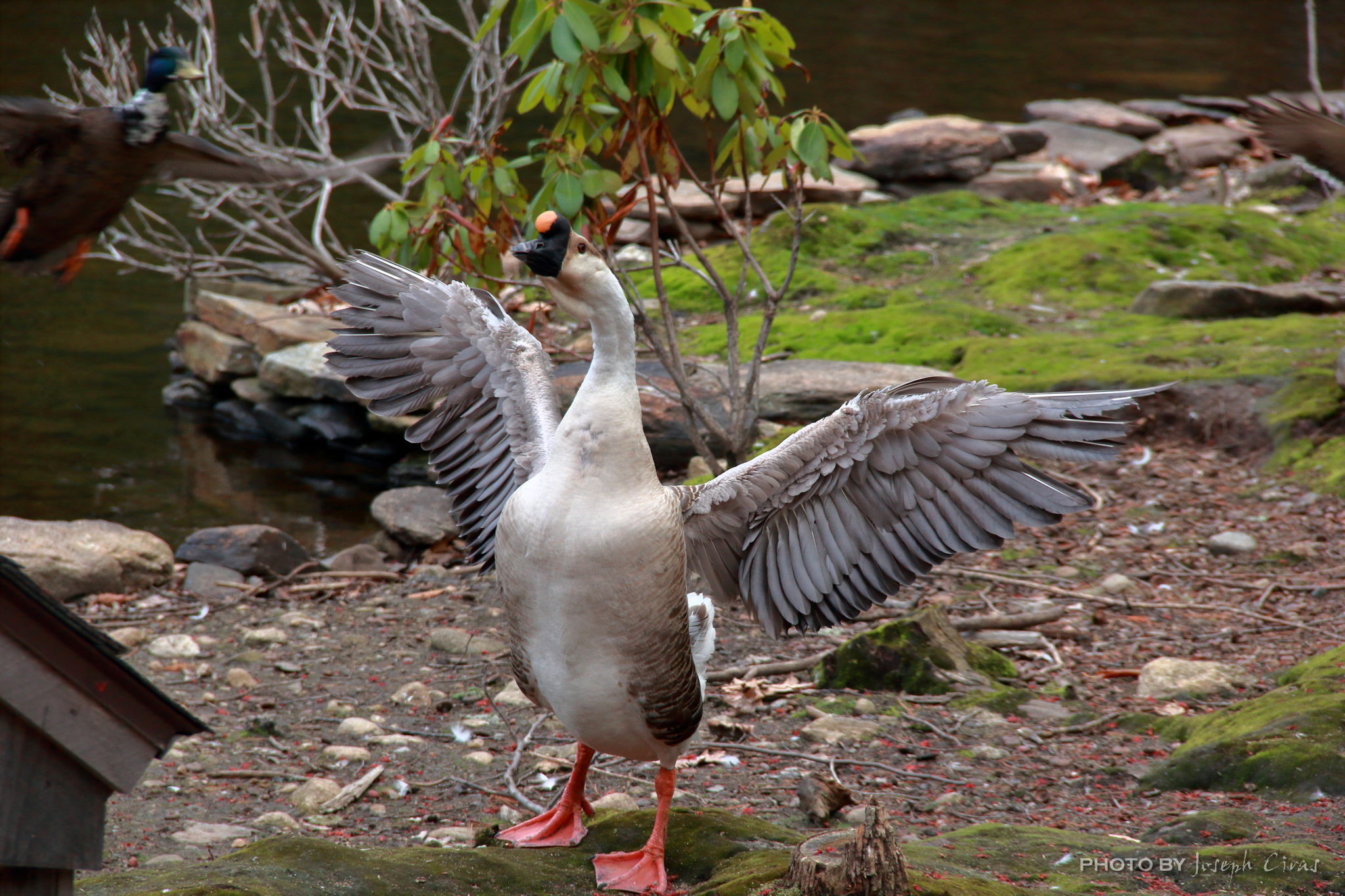 Stopped by the Old Mill today after work to take my photo. When I arrive at the duck pond, I do not know the location of the ducks and geese in the pond. Today, when I arrived, this goose was near the duck house and was eating some bread that someone had given it a few minutes before. When this goose saw me, he stood up and started flapping his wings and squawking.