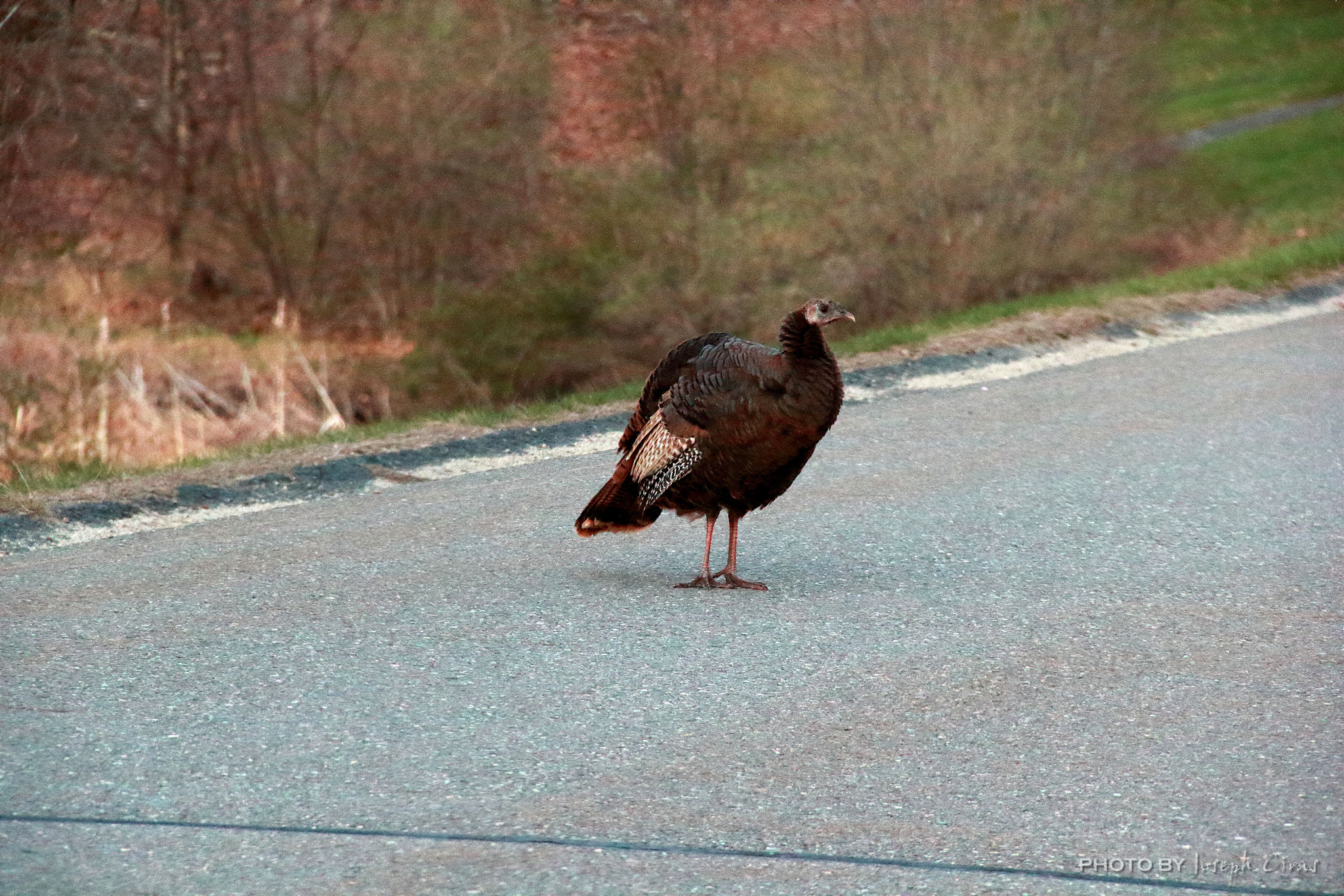 As I was driving into work today, I was stopped by a rafter of turkeys. I have seen these turkeys off the side of the road when either arriving at work or leaving work. Today they were standing in the road and I had to move slowly towards them to get them to move. This one was just standing there looking at me as if it wanted to know what I was doing.