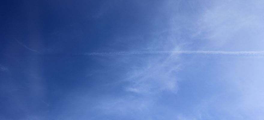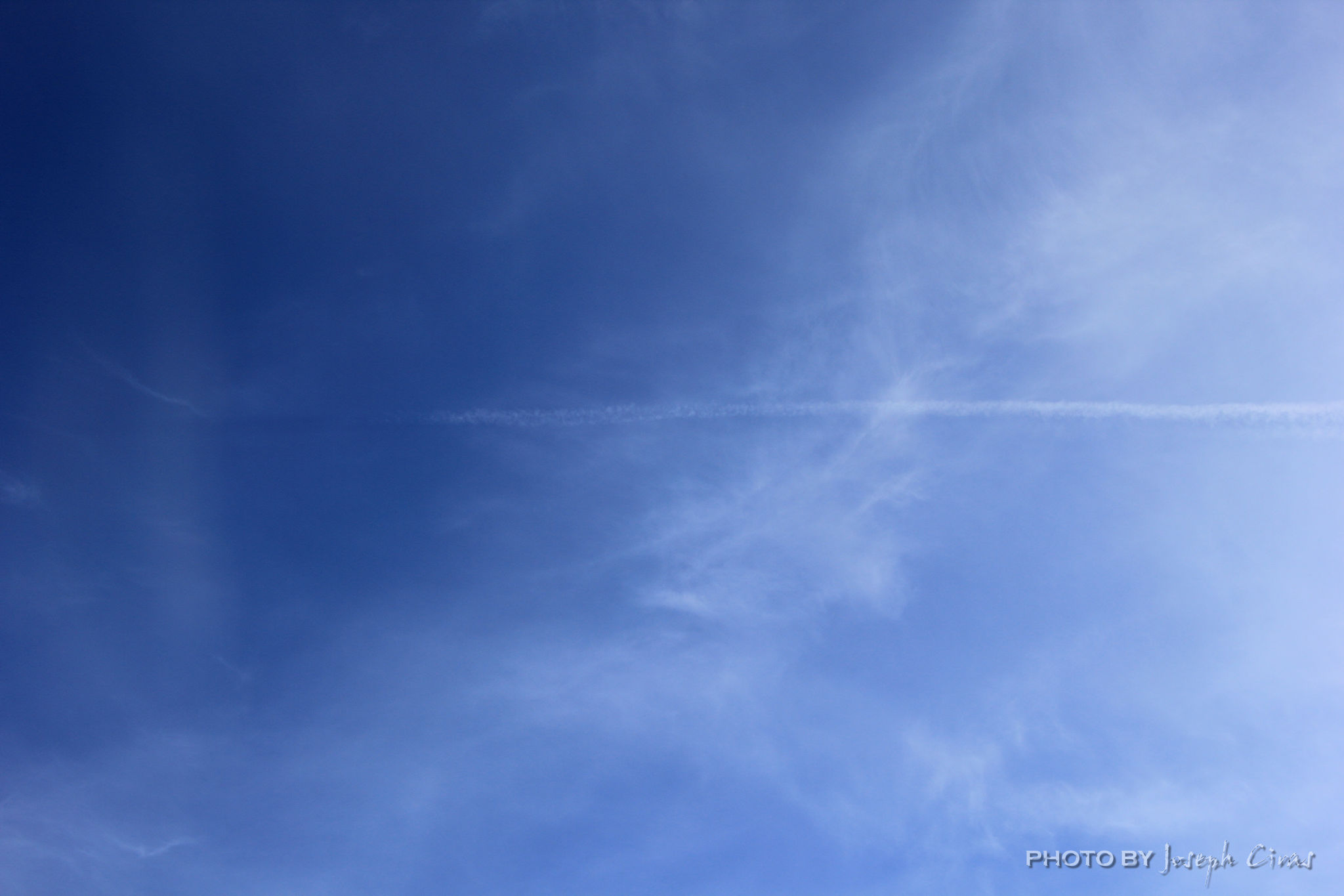 Some of the elements of minimalistic photography are simplicity, negative space, powerful composition, isolation, color, and lines and shapes. Minimalist photography shows the power of a simple solo object. In this case, it is the contrail against the blue sky.