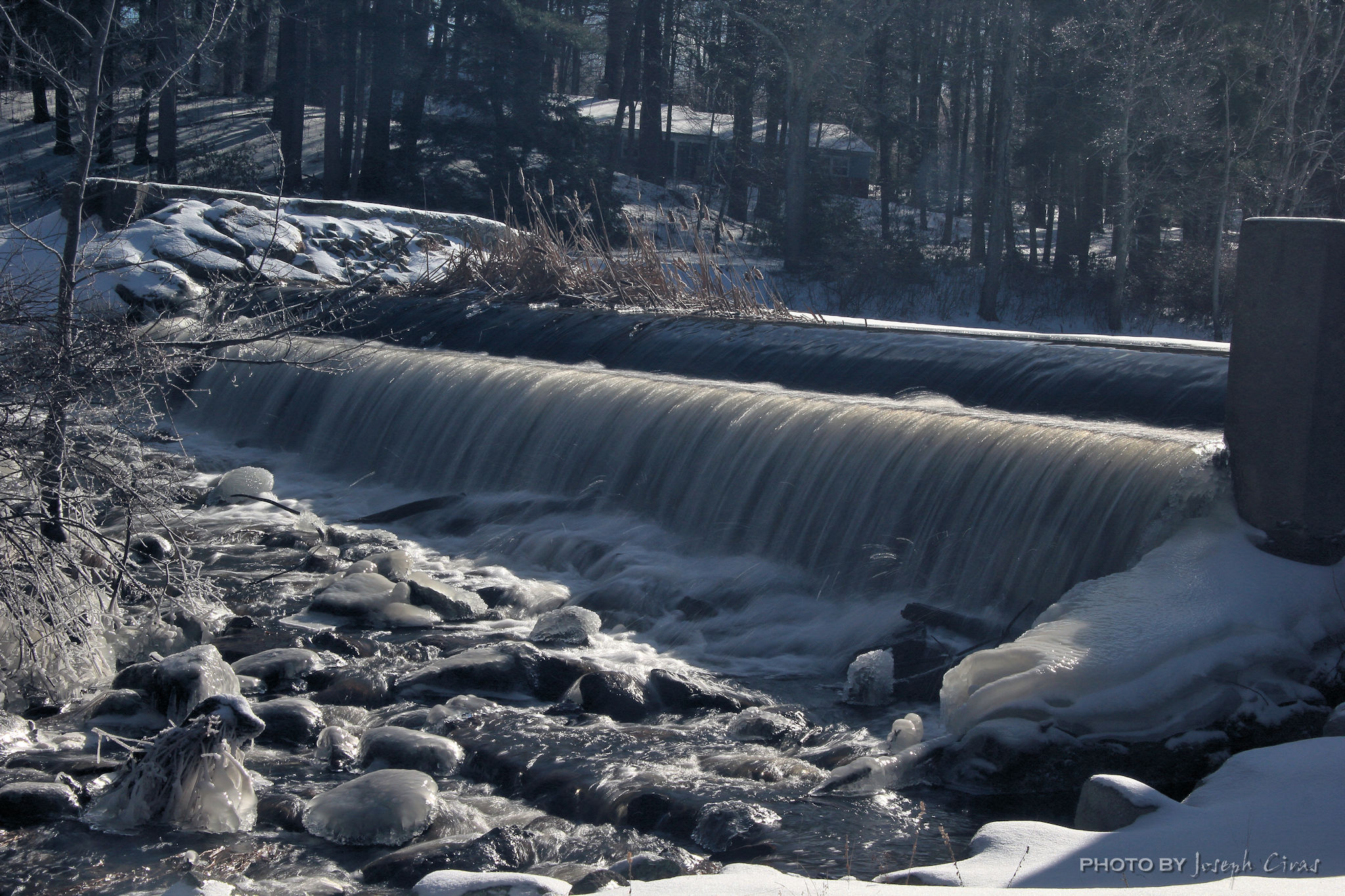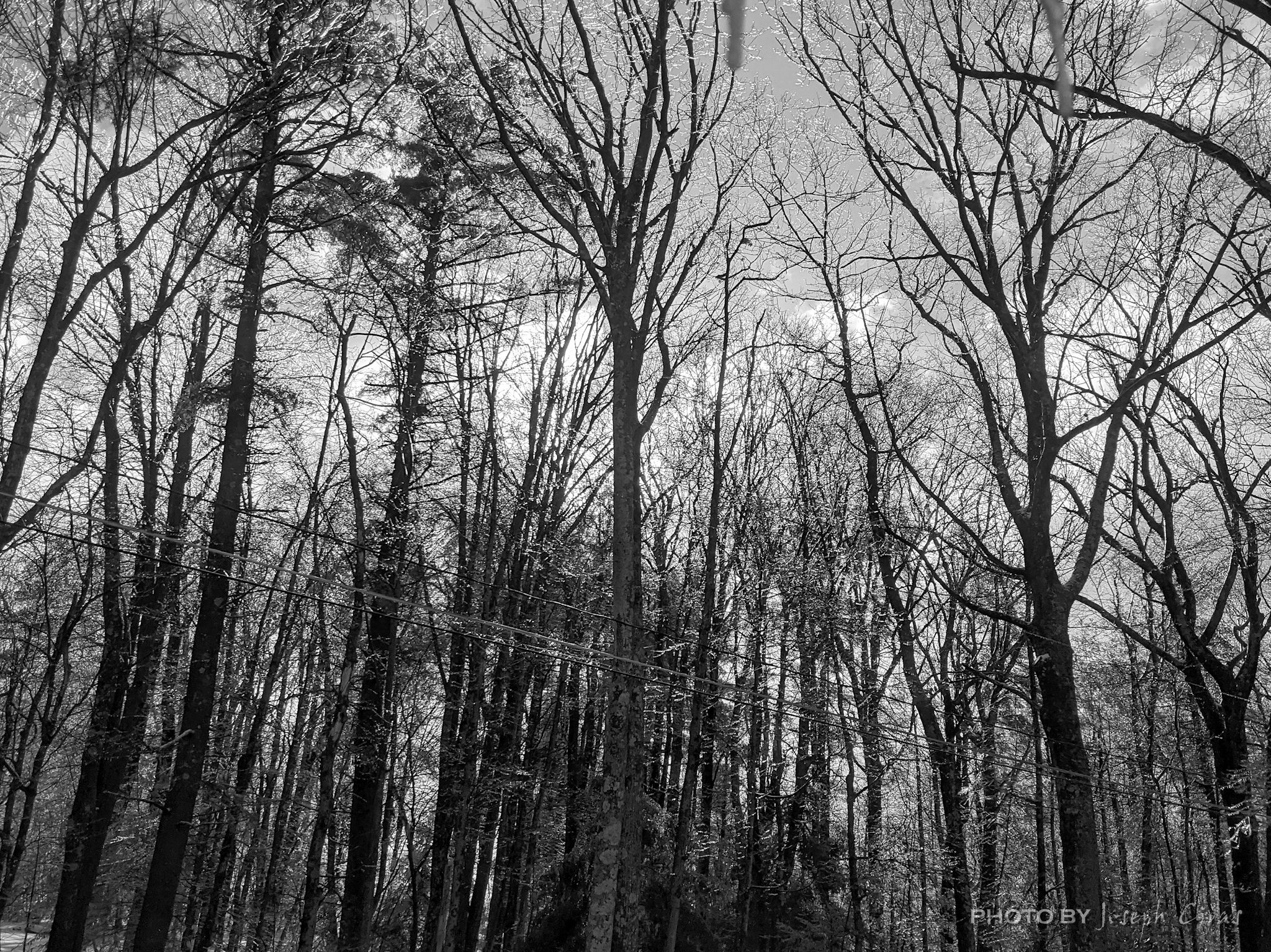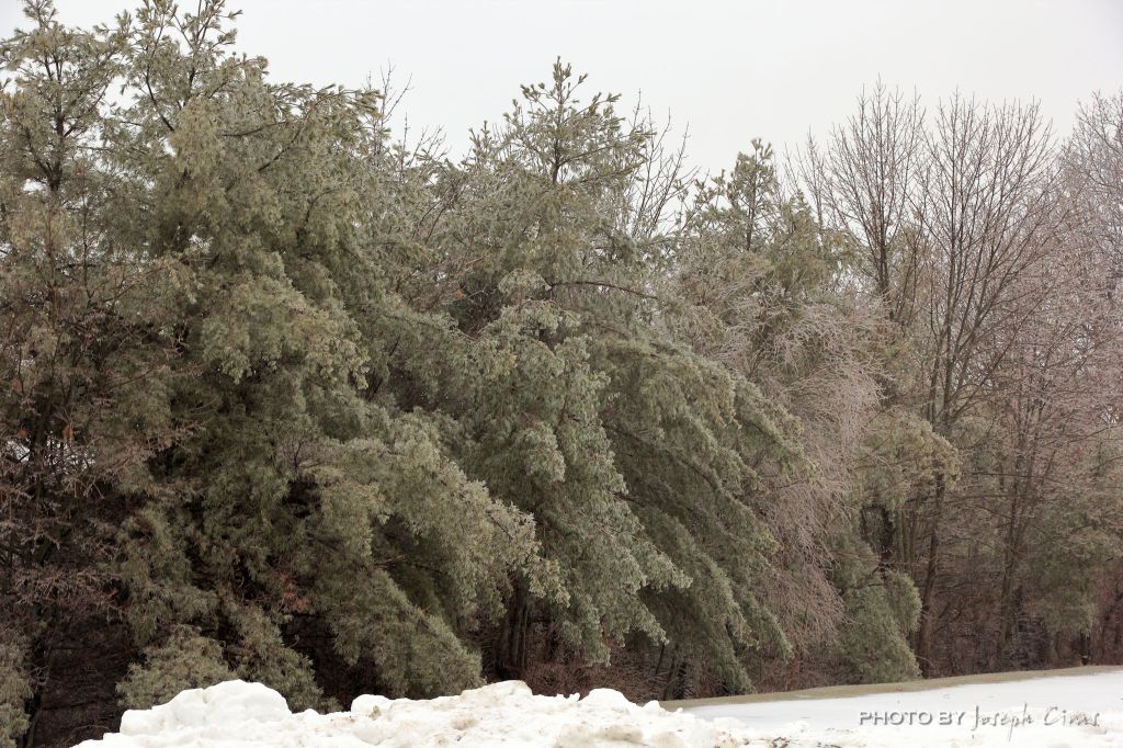 During the day I liked the way the sun was glistering off the ice-covered trees, so I took this photo. I needed a black and white photo for a photo project I am working on, so I converted the photo to black and white.