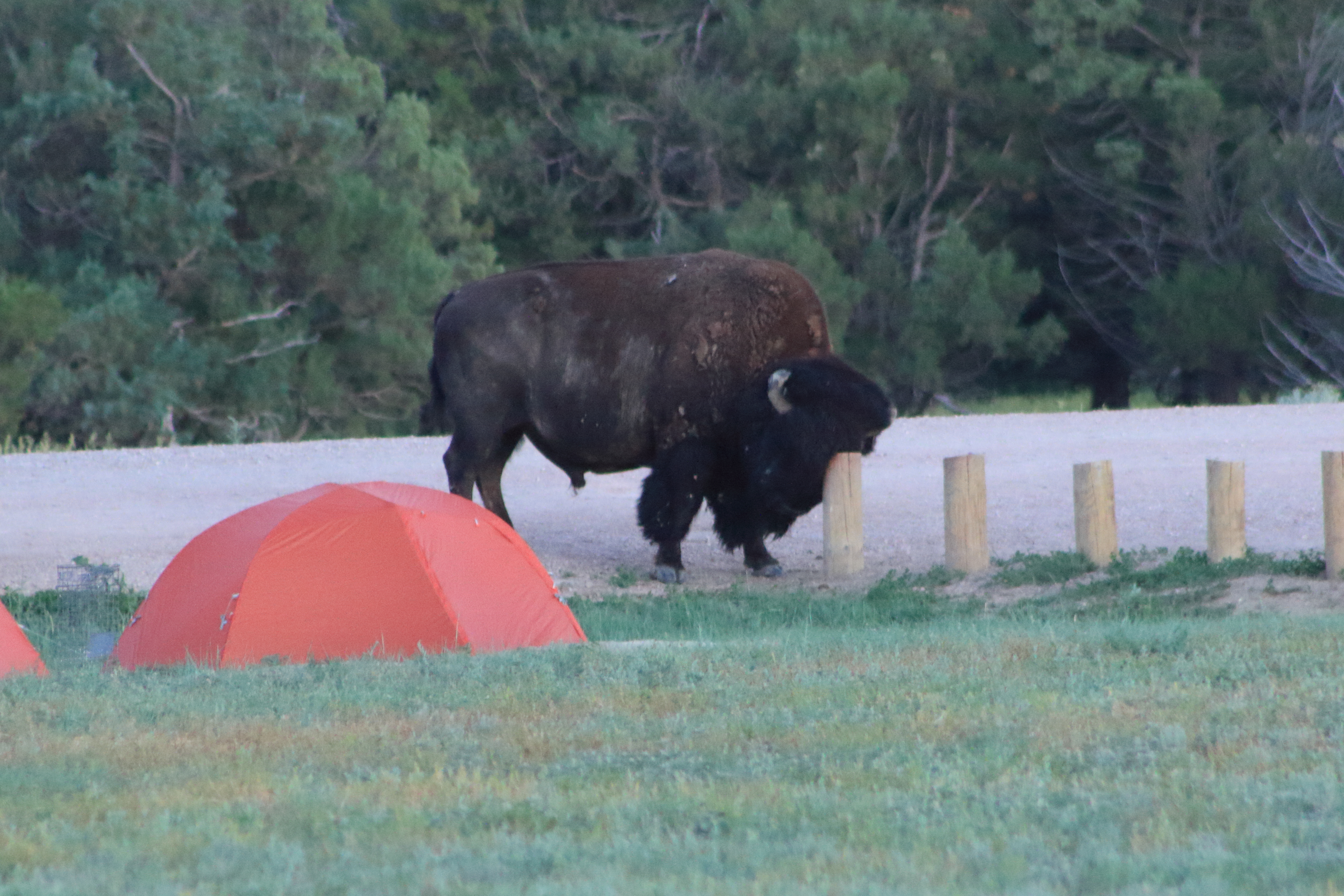 In the same campground, there was a bison that used the site markers as scratching posts. This bison also showed up in the morning. The remote campground had only 10 sites. All eyes were on the bison. People did come out of these tents as the bison moved away.