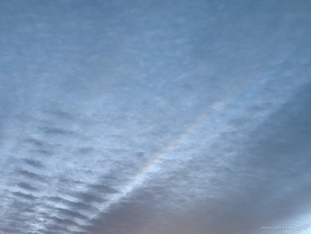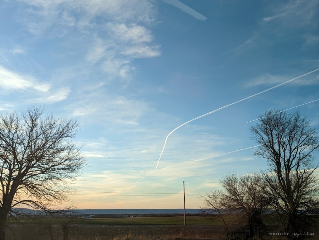 During the ride down to our vacation destination, I noticed the contrail left by at plane as it was turning. Contrails or vapor trails are line-shaped clouds produced by aircraft engine exhaust or changes in air pressure, typically at aircraft cruising altitudes several miles above the Earth’s surface. A little later, I noticed that a plane took a turn and flew in front of another plane. I took my phone out, since I was the navigator at this time, and took a photo.