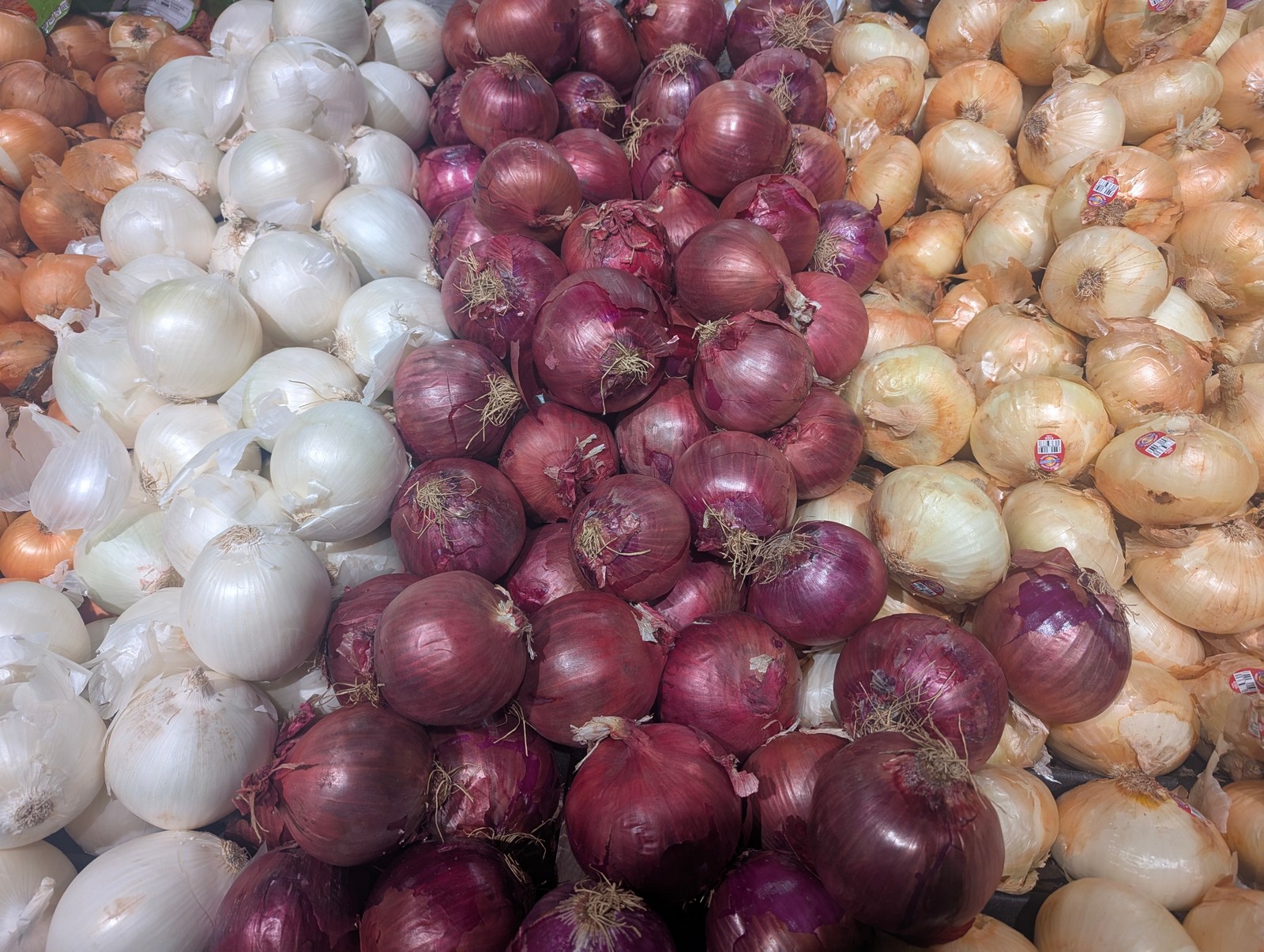 Last night was a special town meeting, so I did my shopping tonight. One of the items I needed to pick up was onions. When I saw the different types of onions next to each other, with their contrasting colors, I took this shot.