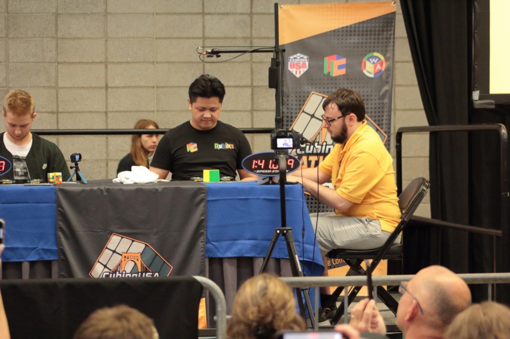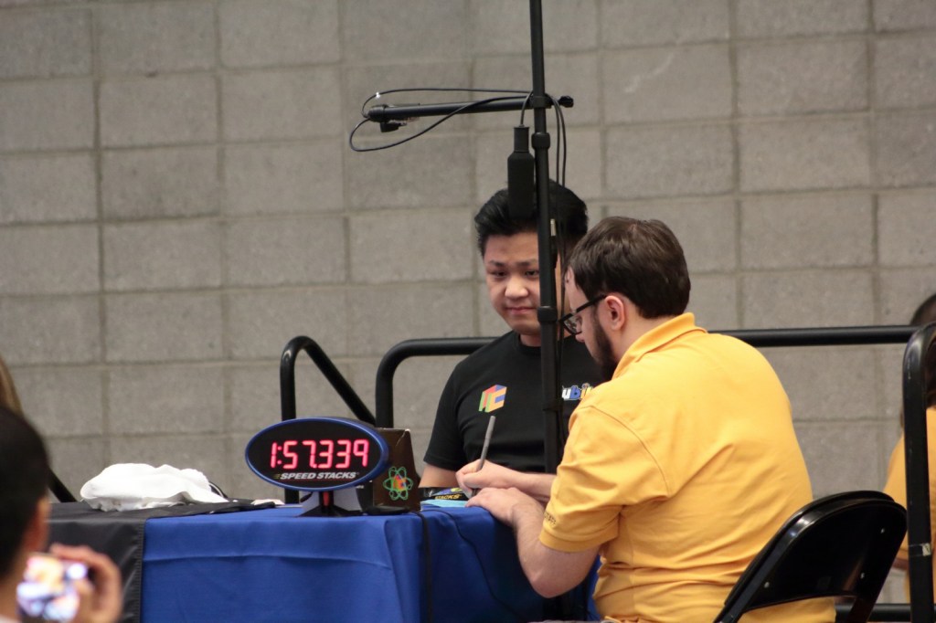 Day two of the competition, some of the top solvers in the world were there. Whenever they would solve, a crowd would gather. The only event without a crowd was the 3×3 multi blind. The winner solved 54 out of 60 cubes blindfolded in the one hour allotted for the event. The former world record holder in the larger cubes (5×5, 6×6, 7×7) did not have the following he once had. The current world record holder in the 3×3, 4×4, 5×5, 6×6, 7×7 had a crowd around him. The current world record holder has autism and started cubing to improve his motor skill and social skills. He still have the mind of a young person, but his mind is sharp. Our son completed in the 4×4 and 6×6 today skipping the skewb event. He would have completed in the skewb, but he did not hear his round get called since he was entering data.