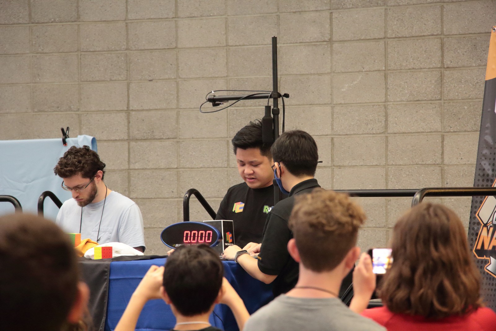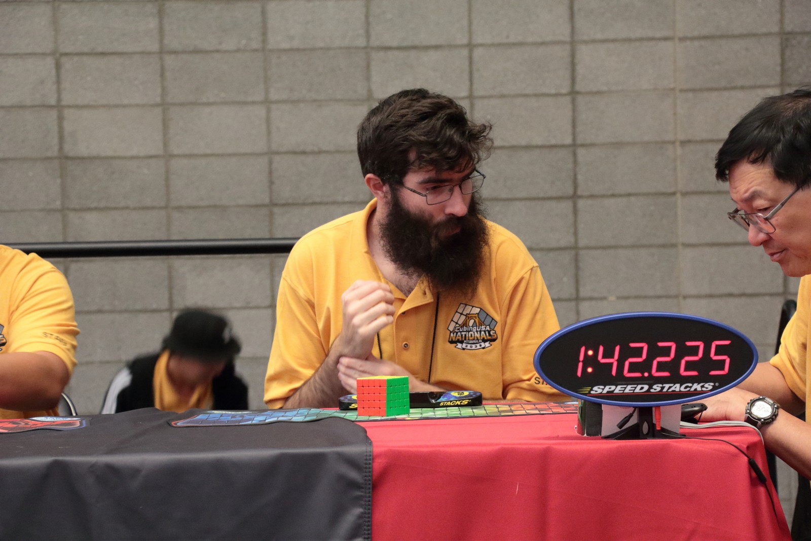 On the first day of the competition, our son competed in the 3×3 one hand and the 5×5. The 3×3 one hand is solving the 3×3 cube using only one hand. Here is a photo of him solving the cube one handed.