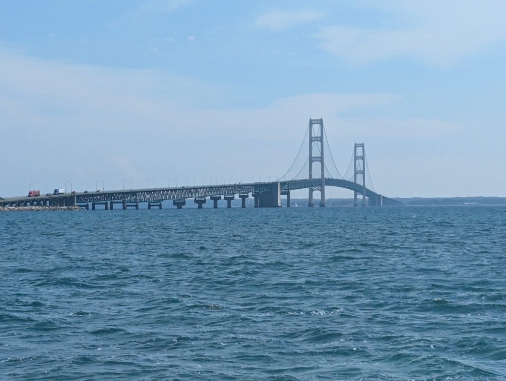 The Mackinac bridge is the third longest suspension bridge in the world. It is the longest suspend bridge in the western hemisphere. It was the longest when it was built. It goes over the Mackinac straight between Lake Huron and Lake Michigan.